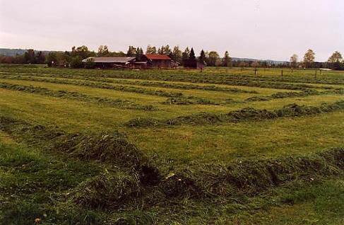 Windrows in the fields. A view of Mietraching with the Alps beyond, from a farm road leading north.