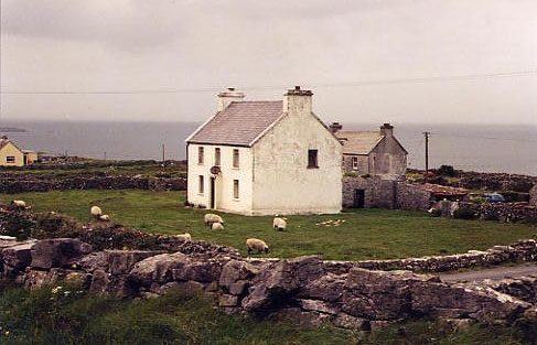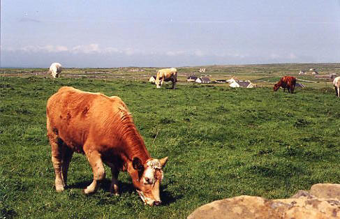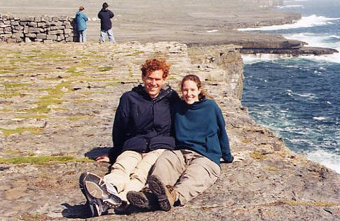 We eventually reached the famous Cliffs of Moher. It had taken over two hours to do the hike and we were interested in a faster way back. We ended up easily hitching a ride back to Doolin with Anita, a friendly local young woman who designs web pages for the hostels and bed and breakfasts in the area. We had dinner that evening at a busy pub called McDermotts. The next day we made our way to dock. Our original intent was to take a ferry to Inishmore, one of the Aran Islands, and then another to Galway, but Doolin Ferries wasn't going to be going to Galway that day due to rough seas. Nor would it be returning from Inishmore. So we got a one-way to Inishmore, planning to catch another ferry company there to Rossaveal, a town on the mainland northwest of Galway. To get to Inishmore we first had to take a ferry to the smallest of the Aran Islands, Inisheer. The boat was tiny and the sea rough. By the time we got to Inisheer, both Ben and I were a bit woozy, so we contented ourselves with visiting a little cafe and then taking a short walk through the village.