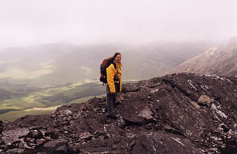 From Binn Leitri we crossed the saddle to Binn Gabhar to the northeast. Next was descending into the saddle between Binn Gabhar and Binn Bhraoin and then down into the lowlands. The way down was tricky -- steep, loose rock, sheep bleating at us periodically, and then as we got lower, very damp. In fact, the wet peat bog that greeted us would keep us company throughout most of the rest of the day.