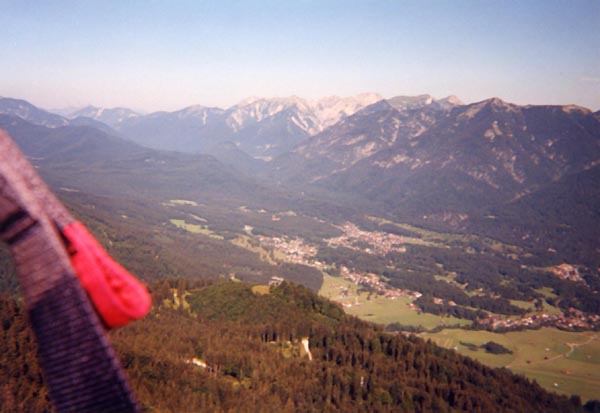 Former Brown fencer watches paragliding. The jump site was near the Zugspitze, tallest peak in the Bavarian Alps. We didn't jump off the big pointy mountain in the middle, though, but rather off the smaller forested one to the left.