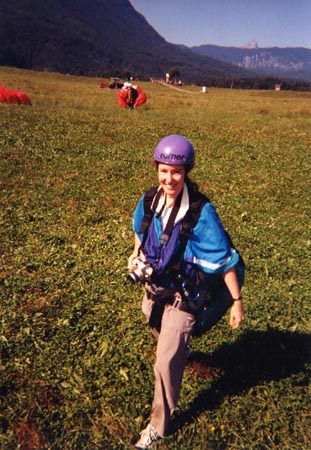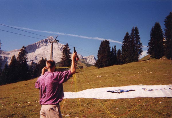 Paragliding In August, a coworker of mine arranged a paragliding trip. One lovely Saturday, about a dozen of us drove to the Alps at Garmisch, strapped ourselves to a group of gangly gung-ho Germans, who set out big pieces of cloth with strings attached, and jumped off a mountain. Okay, really these were tandem jumps, each with an experienced instructor who gave orders such as "run!" at the necessary moments. (Actually, that's the only order. "Run!" both on take off and landing.)