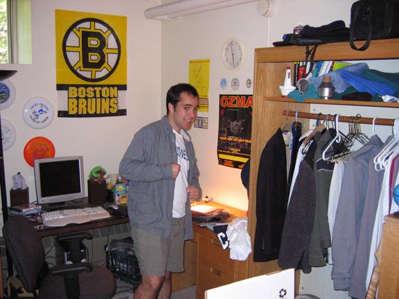 He almost looks happy to leave the days of getting up at 9:00am... Ah, dorm life. All one's worldly possessions squished into one little tiny corner.